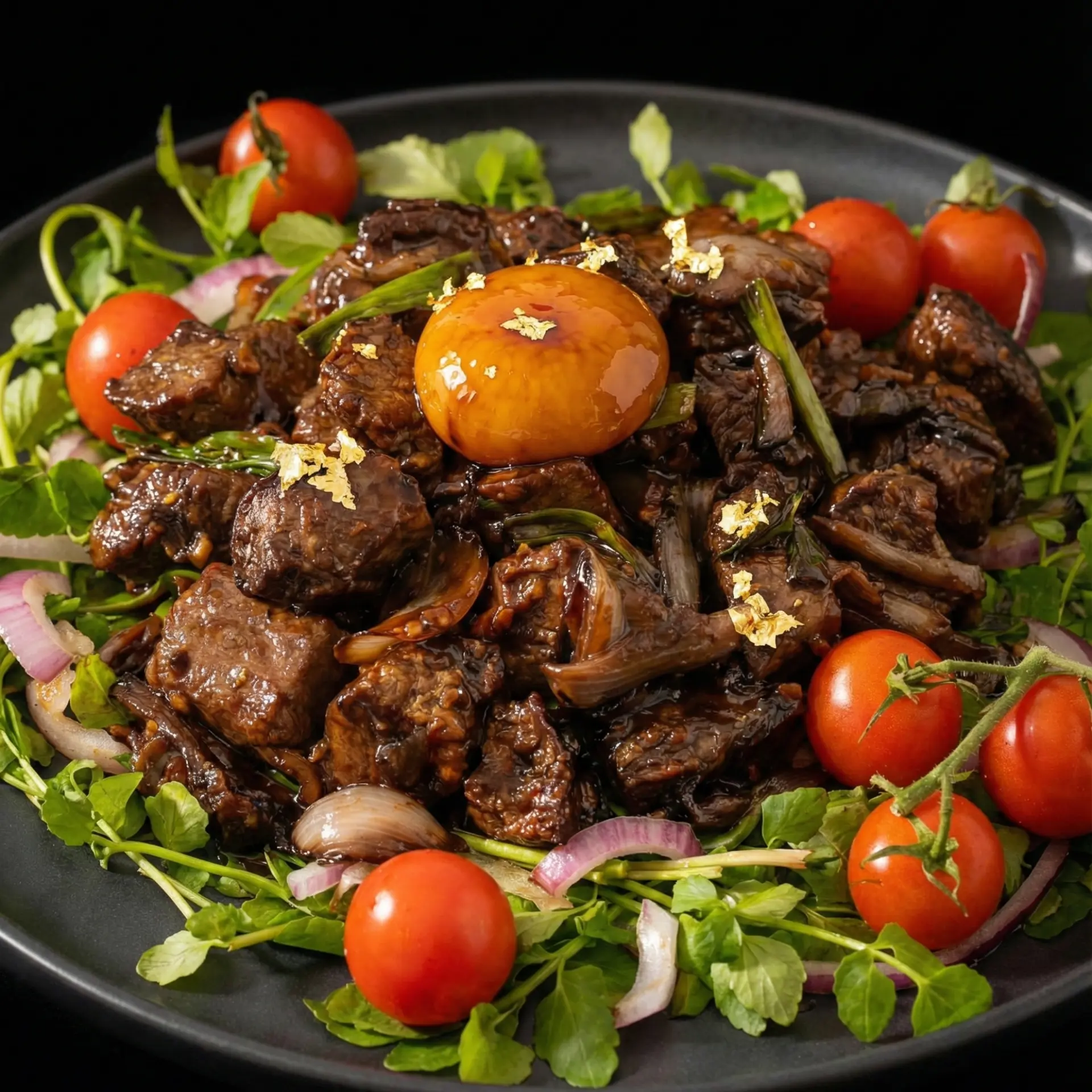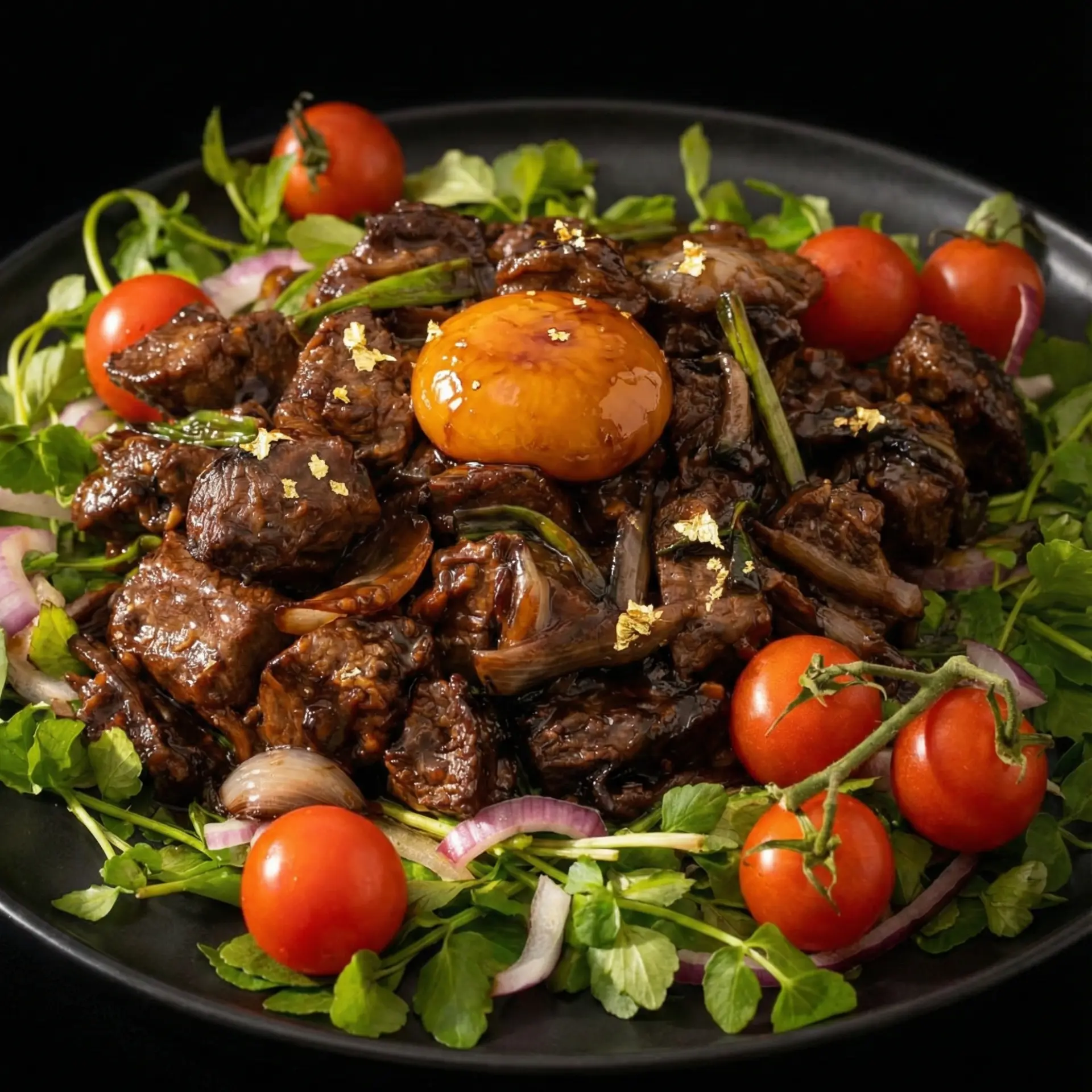 ใช้คีบ คีบ ทองคำเปลว (Edible Gold Leaf) แปะที่ไข่แดงและชิ้นเนื้อกระจายๆ กัน เพื่อเพิ่มมูลค่าและความหรูหรา
