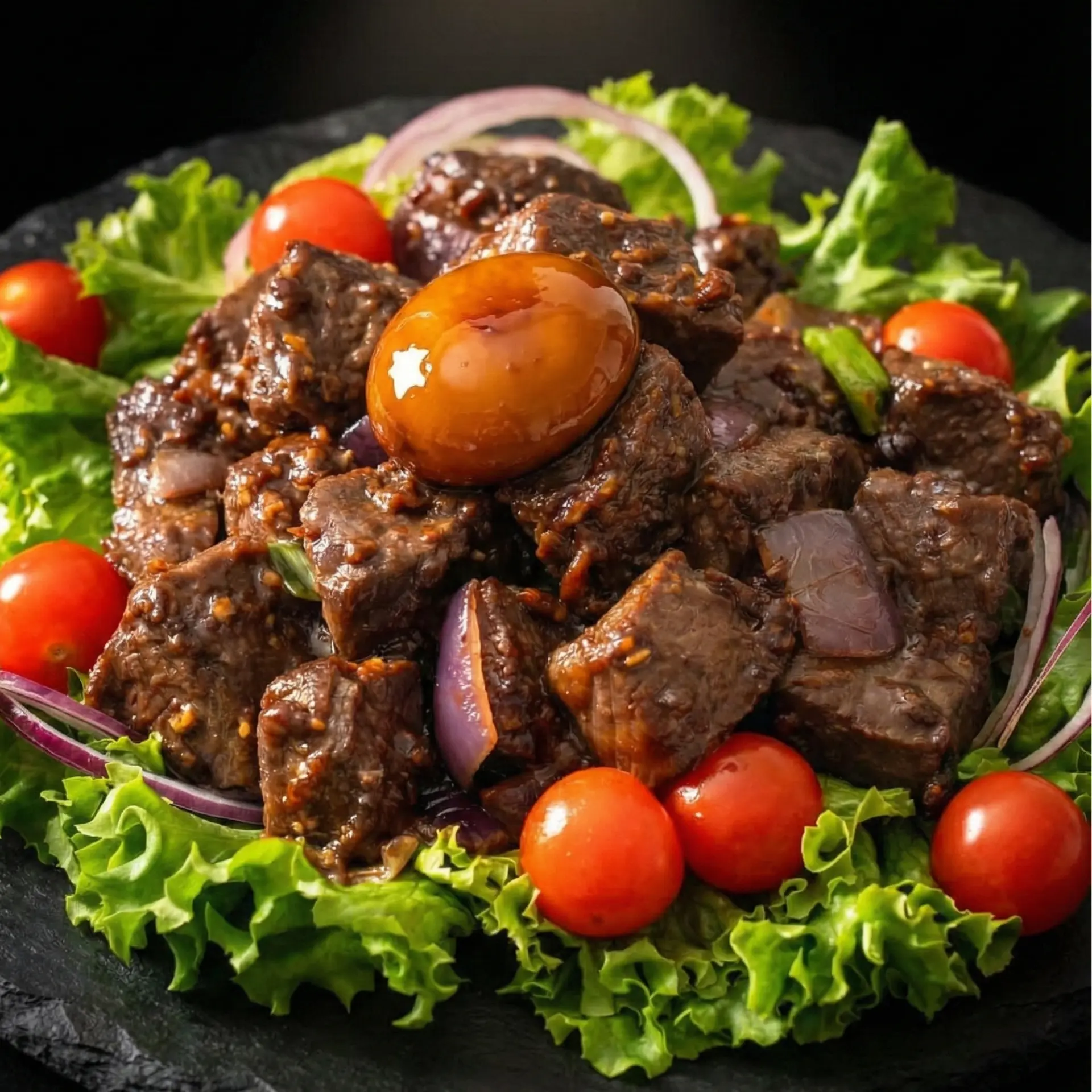 ทำหลุมเล็กๆ ตรงยอดภูเขาเนื้อ แล้ววาง ไข่แดงดองโชยุ ลงไปอย่างเบามือ - สีสัน